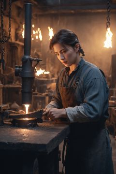 (((photographic))), Euphemina, blacksmith outfit, solo, disdain, wrinkles, shaded face, upper body, looking at viewer, forge background, anvil, sparks (Masterpiece), best quality, (illustration), (ultra-detailed), hyper details, (delicate detailed), (intricate details), octane render, hdr, (hyperdetailed), (soft light), (glowing eyes), ambient occlusion, ambient light, raytraced reflections,(best illumination, an extremely delicate and beautiful), ((cinematic lighting)), (soft), BREAK, 35mm photograph, grainy, professional, 8k, highly detailed, Leica M50 F/1.9
