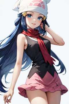 <lora:dawn_v2:1> dawn pokemon, long hair,sleeveless shirt, black shirt, red scarf, blue eyes, dark blue hair, beanie, hairpin, pink skirt,1girl,solo, happy,smile , upepr body,parted lips,white background,