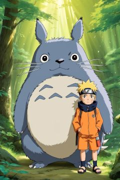 Ghibli artwork Totoro and Naruto Naruto together, dramatic, critical visual, dynamic, highly detailed, studio animation, animated colors, pallas's cat