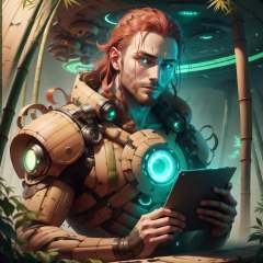 <lora:BambooTech-20:1>, bambootech , scifi, bamboo, fibers , scroll, 1boy,long hair, red hair, glowing eyes, closed mouth, holding scroll,shaved beard, outdoors,