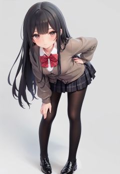 1girl, solo, pantyhose, skirt, long hair, loafers, shoes, simple background, school uniform, brown eyes, plaid, black pantyhose, plaid skirt, looking at viewer, black hair, pantyhose pull, full body, clothes pull, black footwear, pleated skirt, leaning forward, bangs, long sleeves, bent over, cardigan, bow, bowtie, standing, closed mouth, pulled by self, grey background, blush, miniskirt, red bow, sweater, **********