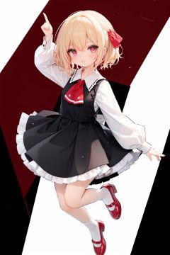 1girl, rumia, blonde hair, solo, white background, red eyes, red footwear, simple background, ascot, short hair, ribbon, open mouth, hair ribbon, smile, long sleeves, shirt, looking at viewer, red ascot, white socks, white shirt, red ribbon, shoes, socks, frills, bangs, outstretched arms, hair between eyes, skirt, :d, dress, vest, mary janes, black dress, black skirt, collared shirt, black vest, blush