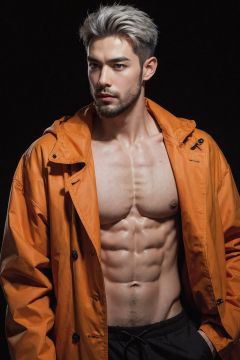 silver_hair,handsome male,beard,(orange coat:1.1),abs,black background,