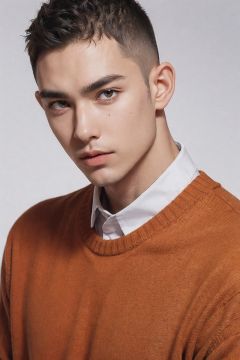 handsome male,(skinhead:0.7),upper body portrait,orange sweater,white background,