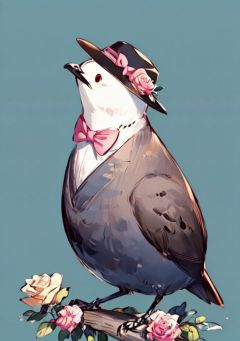 masterpiece, high quality, animal, animal_focus, black_headwear, blue_background, bow, bowtie, flower, hat, no_humans, pink_bow, pink_bowtie, pink_flower, pink_rose, red_bow, simple_background, solo, standing, holding, nail_polish, bird, red_nails, 1other, out_of_frame<lora:Keai-000009:1>