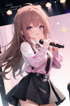1girl, solo, microphone, smile, skirt, blush, brown eyes, long hair, open mouth, looking at viewer, brown hair, long sleeves, :d, shirt, bangs, belt, breasts, pink shirt, outstretched arm, music, black belt, medium breasts, holding microphone, singing