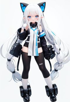 1girl, white_gloves, braid, full_body, gloves, long_hair, official_alternate_costume, pointy_ears, simple_background, solo, standing, very_long_hair, white_background, white hair, blue eyes, paw claw pose, open_mouth