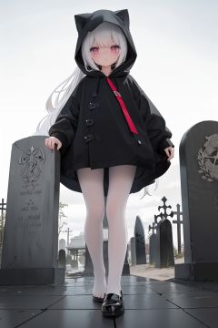 1girl, loli, petite child, white hair, long hair, red eyes, grim reaper, black robe, cat_hood, standing on one leg, another leg up, trample, white pantyhose, foot soles, underfoot, look down, shadow, graveyard, tombstone,beach, (from below:1.2)
