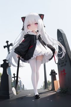 1girl, loli, petite child, white hair, long hair, red eyes, grim reaper, black robe, cat_hood, standing on one leg, another leg up, trample, white pantyhose, foot soles, underfoot, look down, shadow, graveyard, tombstone,beach, (from below:1.2)