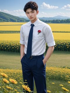 masterpiece,1 boy,18 years old,Look at me,Handsome,Lovely,Sweet,School uniform shirts,Tie,Students,outdoors,Summer,Flower field,Flying petals,Field,Rural area,textured skin,super detail,best quality,