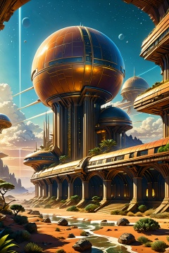 retro scifi landscape, beautiful colours, sharp textures, nikolay georgiev, alex ross, bruce pennington, donato giancola, larry elmore, masterpiece, oils on canvas, trending on artstation, featured on pixiv, cinematic composition, sharp, details, hyper - detailed, hd, hdr, 4 k, 8 k,Renaissance Sci-Fi Fantasy,DonMC3l3st14l3xpl0r3rsXL,more detail XL,High Renaissance,Sci-Fi