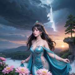 officialart,unity8kwallpaper,ultradetailed,beautifulandaesthetic,beautiful,masterpiece,bestquality,((elegant beautiful girl)),((thunderstorm night)),(zentangle,mandala,tangle,entangle),(ecstasyofflower:1.2)dynamicangle,cowboyshot,themostbeautifulformofchaos,elegant,abrutalistdesigned,vividcolours,romanticism,atmospheric,1girl,twintails,long hair,the background is the magic sky castle,magic jungle,magic flash of fantasy,wearing a colorful fantasy evening gown,magic tower with glitter in the background,falls in the distance,((air airship)),blue ghost fire,(the background is a cliff waterfall),red translucent princess dress,(frost magic),(beautiful fantasy creatures),
