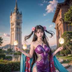 officialart,unity8kwallpaper,ultradetailed,beautifulandaesthetic,beautiful,masterpiece,bestquality,(zentangle,mandala,tangle,entangle),(ecstasyofflower:1.2)dynamicangle,cowboyshot,themostbeautifulformofchaos,elegant,abrutalistdesigned,vividcolours,romanticism,atmospheric,1girl,twintails,long hair,the background is the magic sky castle,magic jungle,magic flash of fantasy,ancient god beast,elegant beautiful girl,wearing a colorful fantasy evening gown,magic tower with glitter in the background,