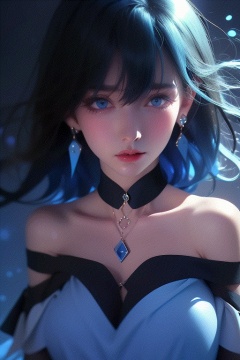 1girl,Bangs, off shoulder, black hair, blue dress, blue eyes, chest, earrings, dress, earrings, floating hair, jewelry, sleeveless, short hair,Looking at the observer, parted lips, pierced,energy,electricity,magic,