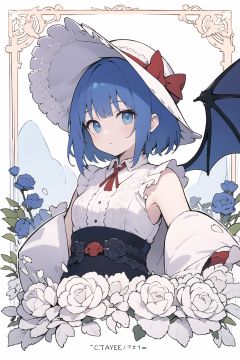 Remilia Scarlet,  zun hat,  extremely detailed lace,  :),  upper body,  arms at sides,  lace,  Blue hair, <lora:EMS-73604-EMS:0.800000>