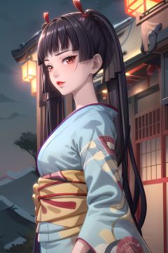 yuanshen,1girl,black hair,looking at viewer,solo,night,twintails,long hair,bangs,japanese clothes,sky,ribbon,upper body,kimono,hair ribbon,blunt bangs,red ribbon,red lips,night sky,red eyes,parted lips,brown eyes,sash,<lora:add_detail:0.5>,<lora:epiNoiseoffset_v2:0.5>,<lora:EnvyBetterHands LoCon_beta2:1>,perfect hands,<lora:阿离1:0.8>,front view,