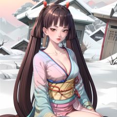 yuanshen, 1girl, solo, japanese clothes, kimono, long hair, sash, brown eyes, twintails, looking at viewer,red lips ,snow, bangs, obi, brown hair, blunt bangs, outdoors, red ribbon, makeup, tree, blue kimono, ribbon, upper body, very long hair, hair ribbon, closed mouth, black hair,<lora:add_detail:0.5>,<lora:epiNoiseoffset_v2:0.5>,<lora:EnvyBetterHands LoCon_beta2:1>,perfect hands,<lora:阿离1:0.8>,front view,cleavage,sitting,mature female,