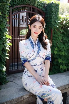 1girl,smile,sitting,upper body,china dress\(haihang\),long hair,<lora:踏山听海【空姐suit】:0.8>,Secret Garden Gate Covered in Ivy,