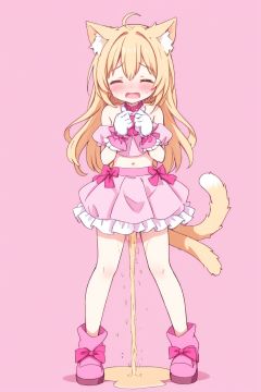 ,peeing, pee, 1girl, peeing self, animal ears, solo, tail, cat tail, blush, embarrassed, breasts, cat ears, long hair, blonde hair, simple background, navel, gloves, fake animal ears, open mouth, pink background, sweat, closed eyes, pink footwear, midriff, pink gloves, skirt, full body, knees together feet apart, crop top, bare shoulders, puddle, frills