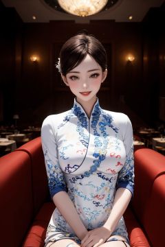 masterpiece,best quality,photorealistic,1girl,smile,sitting,upper body,china dress\(haihang\),long hair,<lora:踏山听海【空姐suit】:0.9>,Moonlit Masquerade Ball in a Grand Hall,