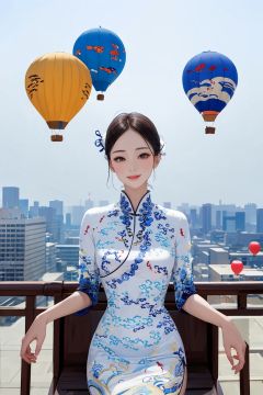 masterpiece,best quality,1girl,smile,sitting,upper body,china dress\(haihang\),long hair,<lora:踏山听海【空姐suit】:0.9>,Whimsical hot air balloons floating in a clear blue sky,