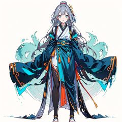 (masterpiece:1.3), (the best quality:1.2), (super fine illustrations:1.2), (Masterpiece), high quality, high detail,((white background:1.2)), looking at viewer, (SOLO:1.4),outline,,simple background, fu hua, fu hua/fushengxianren, grey_hair, blue_eyes, hair_ornament, centre parting bangs, ponytail, taoist robes, chinese_clothes