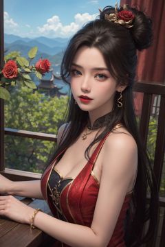 1girl, dress, red dress, hair ornament, jewelry, earrings, brown hair, upper body, bare shoulders, blue eyes, indoors, breasts, chinese clothes, long hair, 1boy, sleeveless, hair bun, closed mouth,solo, blonde hair, crossed legs, long hair, red chinese clothes, window, outdoors, clothes writing, bangs, short sleeves, cosplay,(sitting:1.3), red lips, outdoors, looking at viewer, earrings, necklace, day,roses,sky,blue sky,cloud,rose garden,upper body,flowers,ultra-detailed, highres, extremely detailed,best quality ,masterpiece, illustration, extremely delicate and beautiful,CG ,unity ,8k wallpaper,Amazing, finely detail,official art, <lora:dingdang-xingyaoxs:0.55>