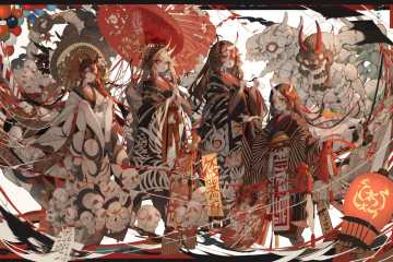 -ghost nocturnal, skull, letterboxed, lantern, red eyes, multiple girls, japanese clothes, horns, mask, oni mask, oni, paper lantern, umbrella, long hair, oil-paper umbrella, kimono, brown hair, skeleton, hair ornament, open mouth, oni horns, ofuda, traditional youkai, looking at viewer, black hair, long sleeves, single horn<lora:ghost nocturnal-000018:1>