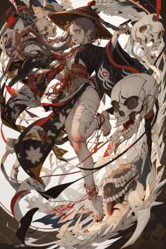 -ghost nocturnal, 1girl, barefoot, long hair, solo, hat, blue eyes, jewelry, ofuda, black nails, skull, bandages, earrings, toenails, japanese clothes, scroll<lora:ghost nocturnal-000018:1>