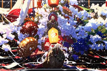 -ghost nocturnal, long hair, solo, umbrella, japanese clothes, lantern, sakazuki, 1boy, male focus, very long hair, alcohol, white hair, kimono, cup, flower, oil-paper umbrella, sitting, smile, cherry blossoms, looking at viewer, closed eyes, sake, wide sleeves, paper lantern, petals, holding<lora:ghost nocturnal-000018:1>