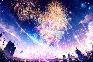 -fireworks, sky, night, night sky, scenery, water, city lights, outdoors, no humans, star (sky), city, cityscape, building, starry sky, aerial fireworks, cloud,coloured glaze,<lora:coloured glaze-000018:1>,