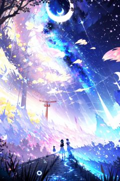 -1girl, scenery, crescent moon, sky, moon, solo, star (sky), torii, bubble, outdoors, tree, black hair, starry sky, night, cloud, short hair, standing, silhouette, night sky, dress, star (symbol), from behind,coloured glaze,<lora:coloured glaze-000018:1>,