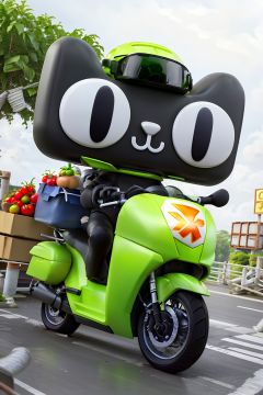 masterpiece, best quality,ell, battery car, ground vehicle, solo, no one, tomato, carton, motorcycle helmet, no humans, tianmao, helmet, smile, motorcycle, sitting, hat, driving, fruit, green headdress, whole body, container, facing the audience <lora:tianmao ip-000006:0.7>