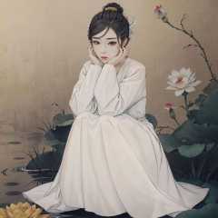 (masterpiece:0.8),best quality,gongbiv,gongbi painting,1girl,solo,black hair,flower,looking at viewer,black eyes,head rest,dress,sitting,hands on own face,lotus,long sleeves,white dress,full body,chinese clothes,lips,hair bun,hands on own cheeks,robe,short hair,lily pad,squatting,cloud,brown eyes,makeup,closed mouth,lipstick,Chinese style meticulous painting,<lora:gongbi painting:0.8>,