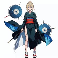 (masterpiece:1.3), (the best quality:1.2), (super fine illustrations:1.2), (Masterpiece), high quality, high detail,((white background:1.2)), looking at viewer, (SOLO:1.4),outline,,simple background, Tsukuyo,scar,Tsukuyo,ninja,kunai,kimono,japanese_clothes,hair_stick,hair_ornament,arm_wrap,autumn_leaves,blonde_hair,black_kimono,scar, scar
