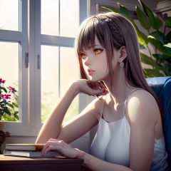 realistic,((masterpiece)), best quality, highly detailed, extremely detailed CG unity 8kwallpaper illustration, ((God's light)), (strong side lighting), (perspective:1.2), (((backlight))), (((Tyndall effect))), (((dense))), ((fog)), ((light leaks)), ((Airborne dust)), depth of field:1.35), ((cold)), library, book on the table, bookshelf, pencil, shiny eyes, hair flaps, (super detailed hair), yellow eyes, glow eyes, (cute animated face:1.3), long eyelashes, ((1girl sitting on the chair)), fair skin, blunt bangs, hair strand, detailed hair, side braid, wavy silver hair, floating_hairline, side braid, crescent earrings, wide eyed, armpits, hair flower, (dappled sunlight on face:1.25), white dress, ////////// blue curtain++++, window, The flowerpot is on the windowsill, plant at background, intricate detail, Cinematic Lighting, focus blur, , , , , , , , , , ,