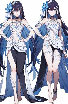 8k, best quality, masterpiece, (ultra-detailed:1.1), (high detailed skin),(full body:1.2), white background, standing, looking at viewer, (solo:1.3), hand on hip,<lora:xier-v100-000027:0.8:lbw=OUTALL>, xier, 1girl, hair ornament, long hair,  hair flower, blue eyes, bangs, barefoot,white dress,(very long dress:1.1),(single side horn ornament:0.5), (white background, simple background:1.4),<lora:EnvyBetterHands LoCon_beta2 辅助:0.55>, ( good hands, nice hands:0.5),(beautiful_face), ((intricate_detail)), clear face,((finely_detailed)), fine_fabric_emphasis,((glossy)), full_shot,