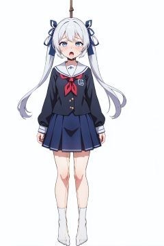 1girl,blue twin_tails,long twin_tails,school_uniform,very short socks,white socks,ankle socks,white background,simple_background, no shoes,barefoot,empty_eyes,mouth_open,tongue_out,rolling eyes,tears,pee,(hanging),rope,Anime