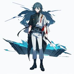 (masterpiece:1.3),(the best quality:1.2),(super fine illustrations:1.2),(Masterpiece),high quality,high detail,(white background:1.2),looking at viewer,(SOLO:1.4),outline,simplebackground,, 1boy,belt,black footwear,black hair,black pants,black shirt,building,closed eyes,earrings,glowstick,hair between eyes,hair ornament,hair stick,jacket,jewelry,
