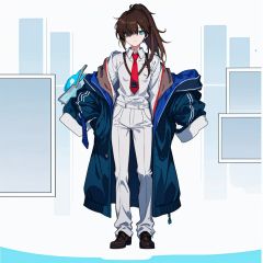 (masterpiece:1.3),(the best quality:1.2),(super fine illustrations:1.2),(Masterpiece),high quality,high detail,(white background:1.2),looking at viewer,(SOLO:1.4),outline,simplebackground,, necktie,hair over one eye,pants,white shirt,shirt,blue jacket,blue eyes,ponytail,hood,jacket,red necktie,brown hair,