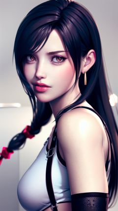 realistic,octane render,1girl, tifa lockhart, solo, long hair, earrings, jewelry, crop top, suspenders, black hair, breasts, looking at viewer, upper body, white **** top, **** top, bangs, midriff, brown eyes, gloves, bare shoulders, shirt, elbow gloves, sleeveless, blue background