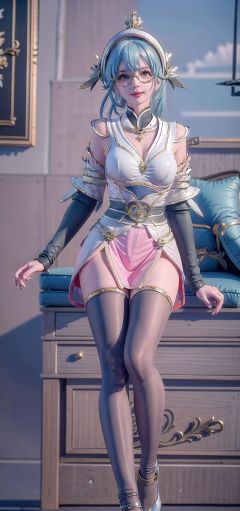 1girl, solo, multicolored hair, hat, smile, blue hair, looking at viewer, glasses, red eyes, detached sleeves, bangs, gradient hair, dress, long hair, white headwear, pink hair,buleweiXF,