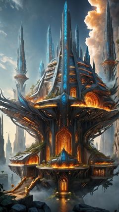(Fantasy Architectural Style) (Fantasy Scene) (Advanced Color Art) (Architectural Art) (Intricate Details) This fantasy building is composed of flying flames, drifting water droplets, rotating wind blades and suspended earth and stone. Each spire represents a natural element that intertwines within and outside the building to create a dynamic and mysterious spectacle. These buildings embody the power of the elements and seem to be the abodes of nature's gods