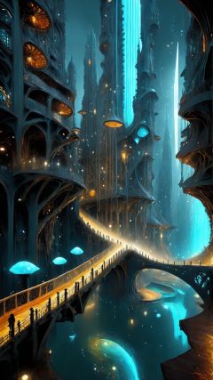 (Fantasy Architectural Style) (Fantasy Scene) (Advanced Color Art) (Architectural Art) (Intricate Details) This is a bridge in a fluid state, its shape constantly flowing and changing, as if it is a strange passage connecting different realities. Pedestrians on the bridge seem to be passing through the liquid-like structure, making the entire bridge look like a supernatural liquid sculpture that challenges the inherent state of matter.