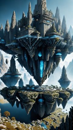 (Fantasy Architectural Style) (Fantasy Scene) (Architectural Art) (Intricate Details) This strange building is composed of suspended rocks, as if it were an upside-down mountain range. Each rock is suspended in the air, intertwined with each other to form a wonderful composition. The entire building is like a combination of mountains and rivers solidified in the sky, breaking the shackles of gravity.