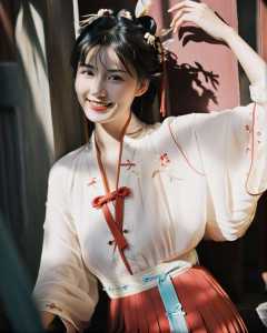 A cinematic upper body photograph of a female , she wearing hanfu of white short shan and red pleated skirt, shadows, black hair, dynamic scene, epic pose, highly detailed face, seductive smile, black eyes, wand, cinematic, fujifilm, intricate, detailed, raw photograph, <lora:hanfuSong_v40_M_SDXL:0.6>