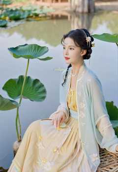 a woman in hanfu with intricate hair accessories, sitting near a pond with large lotus leaves, wearing a translucent dress with floral patterns, in an ethereal outdoor setting, (hanfu, song style outfits, blue short shan, yellow pleated skirt),<lora:hanfuSong_v40_M_SDXL:0.65>
