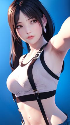 realistic,octane render,3D CG,Sharpening, clarity,1girl,1girl, tifa lockhart, solo, long hair, earrings, jewelry, crop top, suspenders, black hair, breasts, looking at viewer, upper body, white **** top, **** top, bangs, midriff, brown eyes, gloves, bare shoulders, shirt, elbow gloves, sleeveless, blue background
