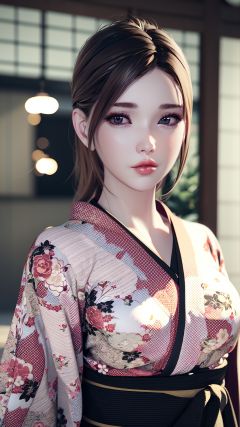 realistic, octane render, 3D CG, 1girl, japanese clothes, solo, kimono, brown hair, realistic, looking at viewer, floral print, lips, blurry