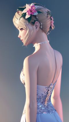realistic, octane render, 3D CG,solo, 1girl, solo, back, hair ornament, blonde hair, realistic, dress, flower, hair flower, from behind, white dress